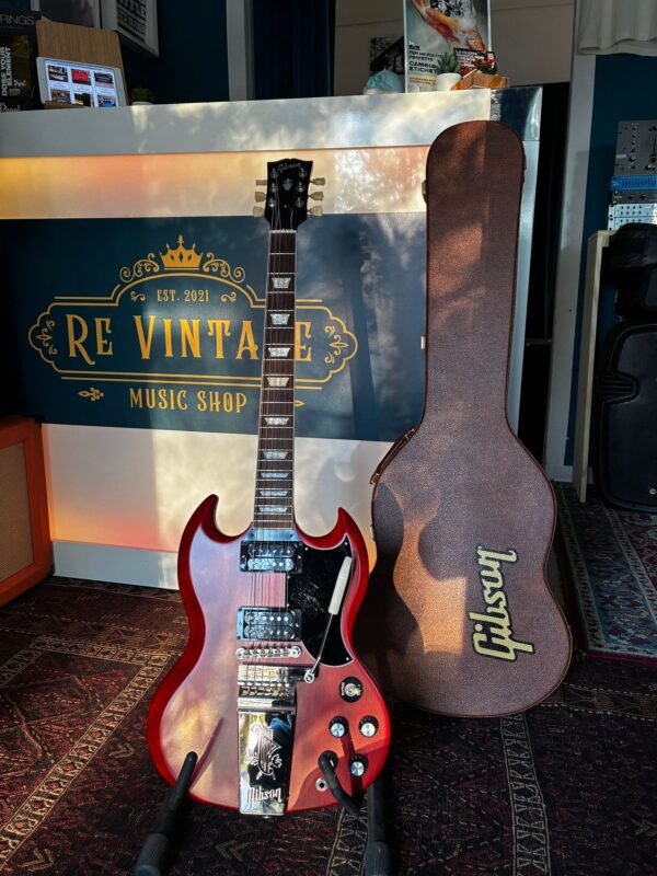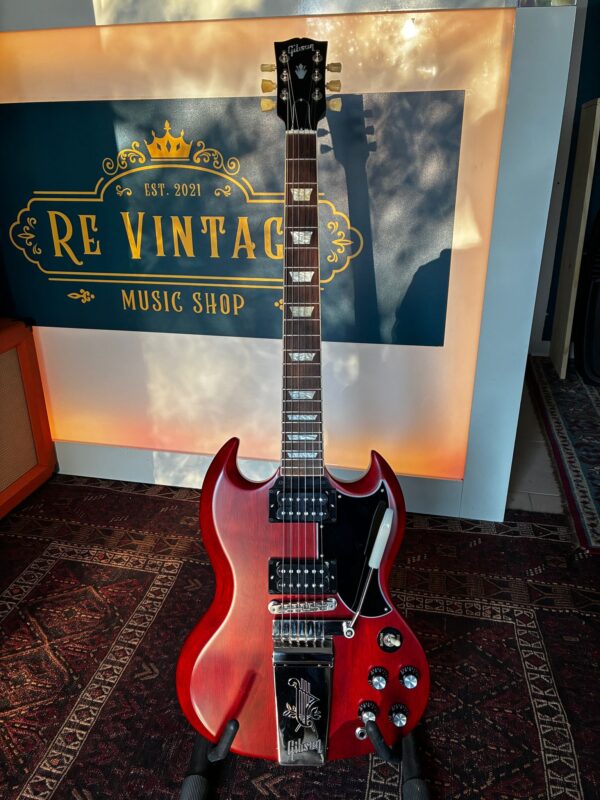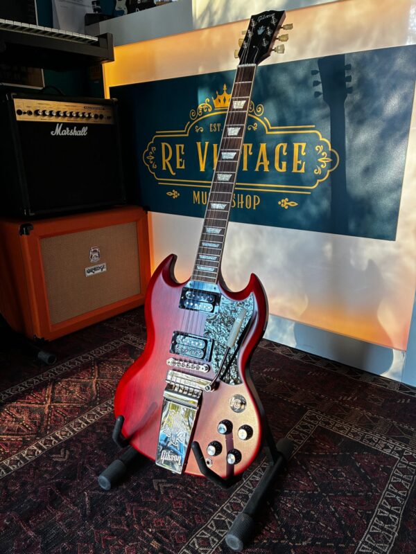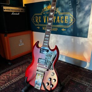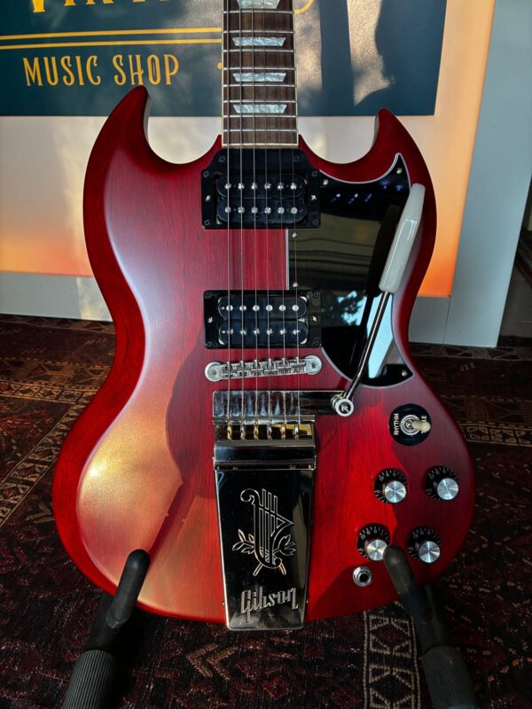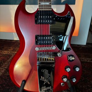 La Maestro Vibrola SG Standard ’61 ritorna al design classico che l’ha resa importante, suonata e amata – modellando il suono attraverso generazioni e generi musicali. Come suggerisce il nome, la Gibson SG Standard ’61 Maestro Vibrola aggiunge il vibrato alla SG Standard ’61. La Maestro Vibrola offre morbidi effetti di vibrato e lo stile classico dell’incisione Lyre sulla cover della cordiera. Le caratteristiche standard includono un sottile manico conico in mogano e una tastiera in palissandro rilegato.